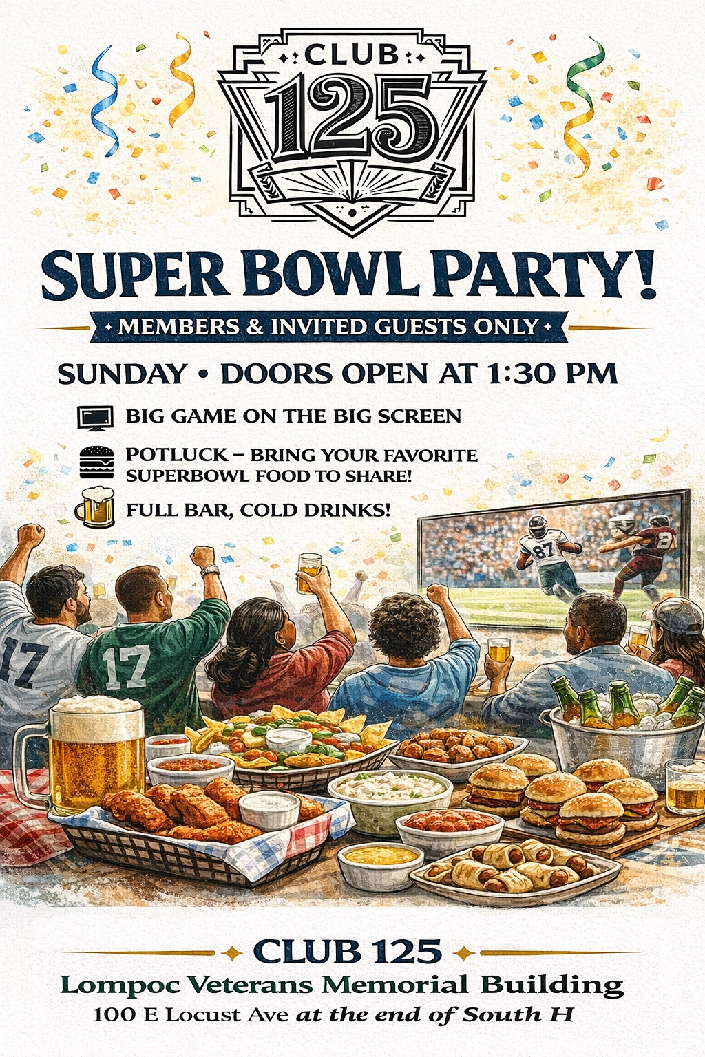We are excited to host our first Club 125 Super Bowl Party, and we invite members to join us for an afternoon of football, food, and fellowship.